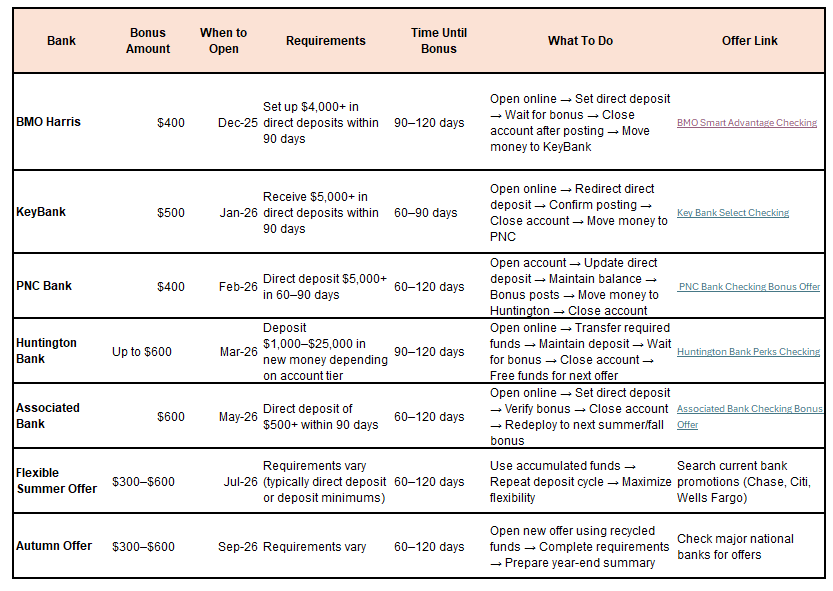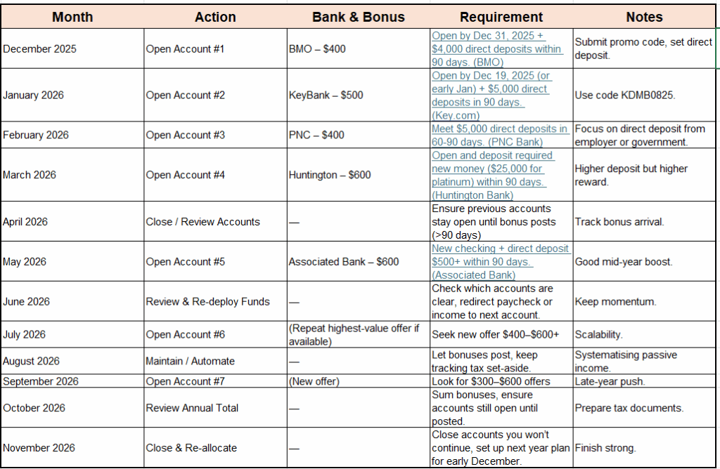 Below is a month-by-month schedule. Use it as a roadmap or in Excel to track open dates, deposit requirements, bonus post dates, and when to close or move funds.